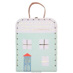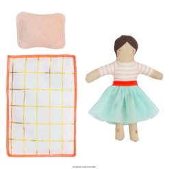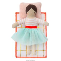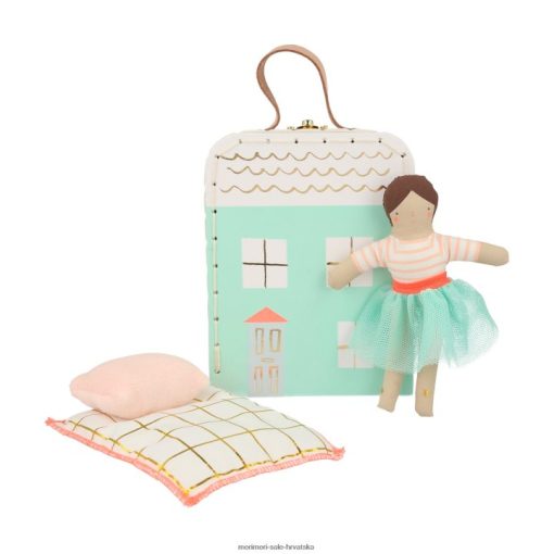 ovo je nevjerojatan dar za mališana da ga ponesu na putovanja ili se s njim igraju kod kuće. sadrži mini kovčeg, lijepo ilustriran da izgleda kao mala kućica, s kožnom ručkom i metalnom kopčom. unutra je preslatka lila pamučna lutka, stilski odjevena u zelenu suknju od tila, a njezin pamučni poplun i ružičasti baršunasti jastuk spremni su za spavanje.