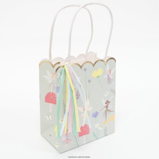 Gosti zabave bit će oduševljeni kad dobiju prekrasnu vilinsku poklon vrećicu – kakav savršen način da završite vilinsku zabavu! izrađene su s elegantnim nazubljenim rubom i sadrže ilustracije plesnih vila, cvijeća i gljiva te detalje od zlatne folije. torbe imaju uvrnute papirnate ručke i prekrasne rese od rafije.