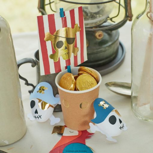 poslužite savršena piratska pića u ovom posebnom setu šalica i slamki. šalice imaju detalje otvora od zlatne folije, a plave slamke od ekološki prihvatljivog papira imaju prugasta jedra s lubanjom i križnim kostima.
