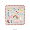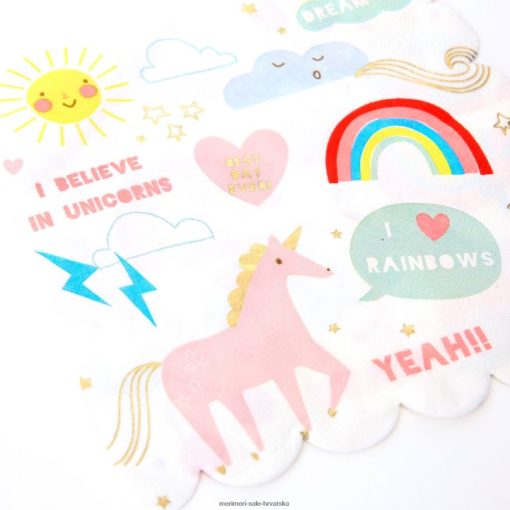 ove divne velike salvete savršene su za zabavu iz bajke, dodajući ukras i praktičnu upotrebu. prekrasno su ukrašeni jednorozima i dugama, ukrašeni sjajnom zlatnom folijom i završeni rubom u obliku kapice.