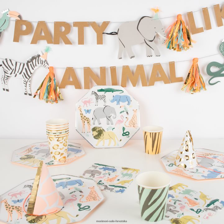 ako želite organizirati zabavu na temu safarija za male istraživače, pogledajte našu fantastičnu kolekciju. uključuje posuđe, kape za zabavu i senzacionalni vijenac, sve zajedno u jednoj kutiji. sve što vam je potrebno, sve lijepo ilustrirano safari životinjama i životinjskim printovima, za organizaciju zabave za 8 gostiju.