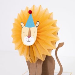 ova šarmantna 3d čestitka s lavom savršen je način da pošaljete najbolje želje posebnoj osobi. ima nevjerojatan nabor od saćastog papira i zabavan šešir za zabavu s pomponima.