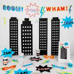 trenutačno pretvorite slavljeničku tortu u svijet čuda superjunaka s ovim fantastičnim kompletom preljeva za torte. prikazuju visoke nebodere i klasične riječi iz stripa, boom!, zap i wham!.