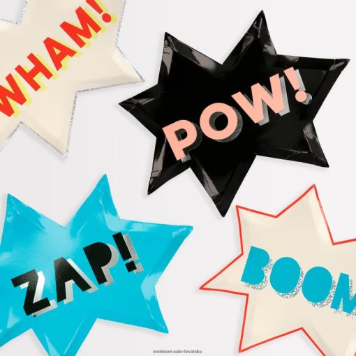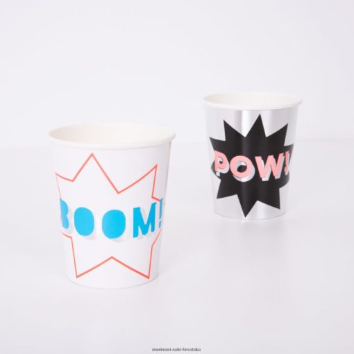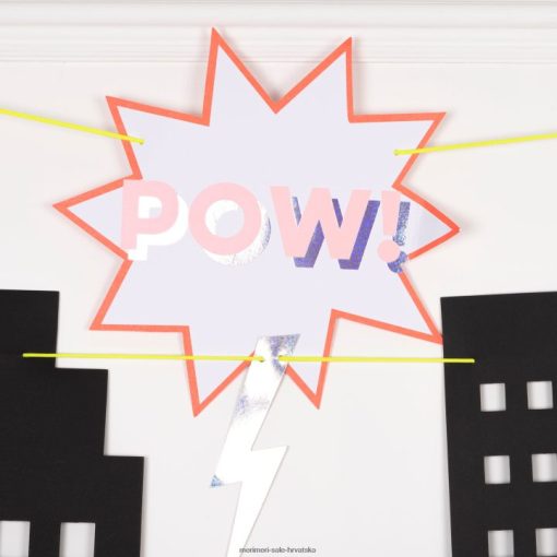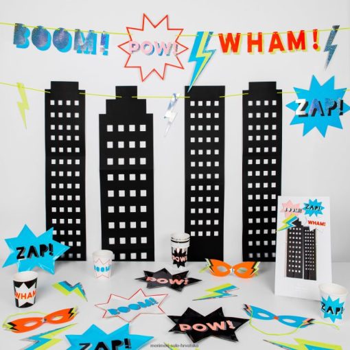 bum! pow! zap! borite se protiv zločina protiv zabave uz našu kutiju za zabavu superheroja. ima upečatljivi vijenac za pozadinu u stilu gotham citya; maske; nadjev za torte; ploče; salvete i šalice – s puno efekta sjajne srebrne holografske folije.